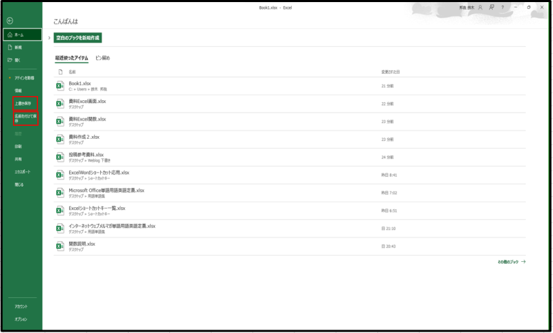 今回は、Exceとはをテーマに記事を書きましたが、初心者がExcelで作業する際に、最初に覚えて欲しい場所(機能)は、エクセルのプログラムを立ち上げた時、又はファイルタブを選択した時に表示(Backstage)される中にある「名前を付けて保存」と「上書き保存」の2つです。